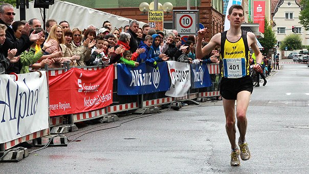 Doppelsieg für TF Feuerbach - Timo Bracht mit neuem Streckenrekord Halbmarathonsieger Fabian Schnekenburger beim Zieleinlauf. (Foto: Hubert Richter)Mehr Bilder (Klicken zum Vergrößern):