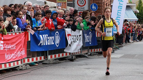 Doppelsieg für TF Feuerbach - Timo Bracht mit neuem Streckenrekord Halbmarathonsiegerin Anja Maurer beim Zieleinlauf. (Foto: Hubert Richter)Mehr Bilder (Klicken zum Vergrößern):