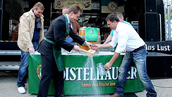 Am Sonntag wurde es kühl und nass Sah gefährlicher aus als er war: Fassbieranstich durch Bürgermeister Peter Reichert auf dem Leopoldsplatz. (Foto: Claudia Richter)Mehr Bilder (Klicken zum Vergrößern):