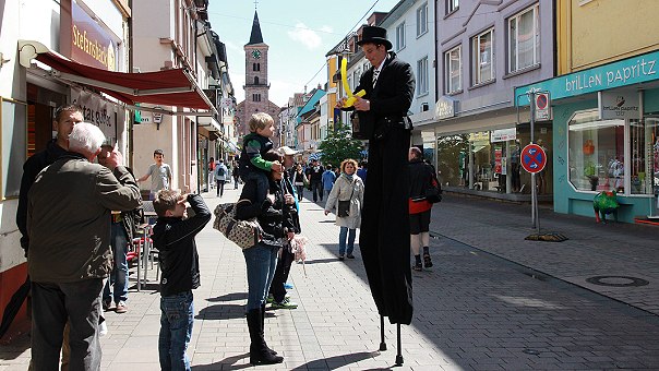 Am Sonntag wurde es kühl und nass Stelzenmann "Jeremy" am Sonntagnachmittag bei verkaufsoffenen Geschäften in der Bahnhofstraße. (Foto: Hubert Richter)Mehr Bilder (Klicken zum Vergrößern):