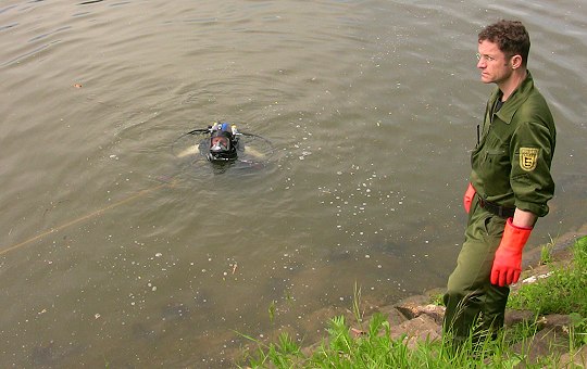 Auf Veranlassung des Polizeireviers Eberbach suchte heute Ralf Bettinghausen von der Wasserschutzpolizei Heidelberg mit drei Tauchern der Wasserschutzpolizei Baden-Württemberg im Beisein eines Taucher-Rettungssanitäters die Skulptur auf dem Grund des Neckars. Aber der Bronzeeber tauchte nicht auf. Metallschrott anderer Art wurde allerdings gefunden, unter anderem Fahrräder und ein Mofa.