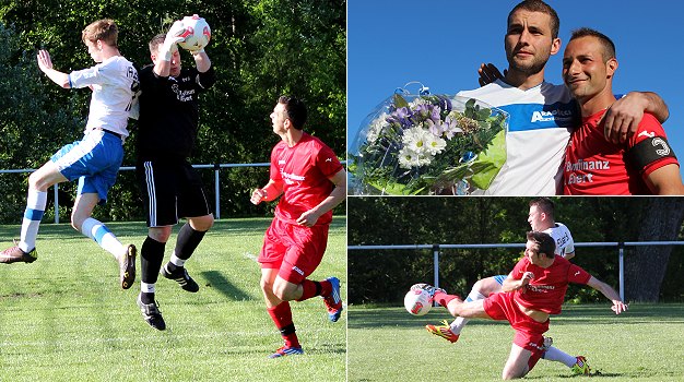 Doch bevor das Spiel der Kreisklasse A begann, beglückwünschte der SV die Gäste von nebenan für ihren Aufstieg in die Kreisliga mit einem Blumenstrauß, der von SV-Spielführer Guiseppe Lanzallotto (kleines Bild rechts) an seinen VfB-Kollegen Gregor Kurpan übergeben wurde.