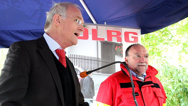 Eberbachs Bürgermeister Peter Reichert dankte den Lebensrettern für ihr Engagement und meinte in Anspielung an den Dauerregen während der Veranstaltung, dass die DLRG derzeit besonders reich von der Natur mit "ihrem" Element Wasser beschenkt werde. Der Vorsitzende des DLRG-Bezirks Rhein-Neckar, Volker Wesselin, sprach von einer angespannten Helfersituation und regte eine verstärkte Mitgliederwerbung an. Weitere Grußworte zum Jubiläum spachen die Landtagsabgeordneten Elke Brunnemer (CDU) und Thomas Funk (SPD), außerdem der Bundestagsabgeordnete Lothar Binding (SPD).