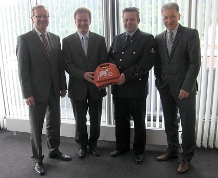 Diese Defibrillatoren sind so konzipiert, dass sie jeder Laienhelfer im Ernstfall einsetzen kann. Deshalb werden die Defis vorrangig an Orten angebracht, die für jeden öffentlich zugänglich sind. Aber auch Mobilität ist gefragt, und so ging ein Gerät an die Freiwillige Feuerwehr nach Eberbach.