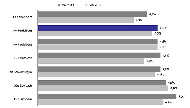 Arbeitslosigkeit geht leicht zurück Arbeitslosenquoten im Mai. (Grafik: Bundesagentur für Arbeit)(bro) (aa) Von April auf Mai hat die Zahl der arbeitslosen Menschen im Bezirk der Agentur für Arbeit Heidelberg um 185 auf 15.951 abgenommen. Gegenüber dem Vorjahr ist die Arbeitslosigkeit jetzt um 1.247 höher. Die Arbeitslosenquote im Mai ist von 4,7 auf 4,5 Prozent gesunken.