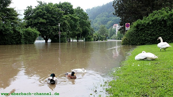 In der Eberbacher Innenstadt berichtete die Feuerwehr, dass immer mehr Personen die Absperrungen missachteten und sogar Kinder in den überfluteten Straßen im Wasser spielen oder mit Fahrrädern ins Hochwasser fahren. Aufgrund der großen Gefahren wegen des unsicheren Untergrunds und der unberechenbaren Strömungen werden die Besucher Eberbachs dringend gebeten, den Altstadtbereich zu meiden und sich unbedingt an die Absperrungen zu halten.