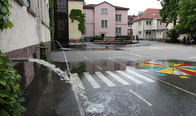 In der Schule laufen seit mehreren Stunden die Pumpen (unser Bild), um das im Keller eindringende Wasser aus dem Gebäude zu befördern. Diese Maßnahmen werden auch morgen Vormittag noch erforderlich sein, da der Neckarpegel vermutlich erst gegen Mitternacht zu sinken beginnen wird.