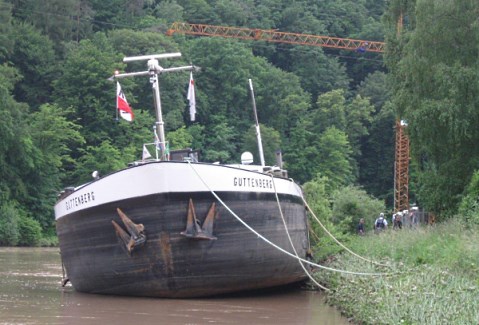 Binnenschiff sitzt bei Neckarsteinach auf den Ufersteinen fest (Foto: Polizei).(lct) (pol) Nicht ausreichend Beachtung schenkte die Besatzung eines deutschen Binnenschiffes den sinkenden Pegelständen nach dem starken Hochwasser am Neckar. Dies hatte am Montagnachmittag, 3. Juni, zur Folge, dass das leere Schiff, das an der Schiffswerft auf den Einbau eines neuen Motors wartet, mit der Backbordseite auf den Ufersteinen aufsaß und dadurch in leichte Schräglage geriet. Schäden entstanden nach bisherigen Erkenntnissen weder am Schiff noch an der Uferböschung. Über ein geeignetes Freischleppen wird durch das zuständige Wasser- und Schifffahrtsamt Heidelberg entschieden. Die weiteren Unfallermittlungen werden durch die Wasserschutzpolizei Heidelberg geführt.