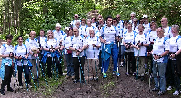 Sportlicher Sommertag mit dem Schlagerstar und Sirtaki im Ittertal (Foto: Claudia Richter)(cr) Im Wald des Fürsten zu Leiningen in Eberbach wurde heute Vormittag Sirtaki getanzt. Die Eberbacher Firma Atro Provita, ein Tochterunternehmen der Gelita AG, lud Kunden ein, die gemeinsam mit Schlagerstar Costa Cordalis sangen, tanzten und dann eine Nordic-Walking-Tour machten.