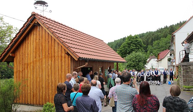 In mehrjähriger Arbeit haben zahlreiche ehrenamtliche Helfer, Firmen und Institutionen gemeinsam das Waaghäusel an der Baumannstraße errichtet. Es beherbergt jetzt die alte Viehwaage, die früher im Oberdorf stand und dort vor einiger Zeit abgebaut werden musste. Man wollte die historische Einrichtung für die Nachwelt erhalten und entschied sich für den Neubau eines Waaghäuschens. Vom Bauantrag im Jahr 2000 bis zur Fertigstellung nahm das Projekt unter Federführung des Heimatvereins einige Zeit in Anspruch. Dank mehrerer Sponsoren blieben die Kosten mit rund 23.500 Euro in erträglichem Rahmen, und die Helfer packten in rund 1.050 Einsatzstunden kräftig an. Neben dem Häuschen wurden eine gemütliche Sitzgelegenheit und ein Brunnen errichtet, beides aus heimischem Sandstein. Nachdem Horst Weis vom Heimatverein die Gäste bei der Einweihungsfeier begrüßt und die Entstehungsgeschichte des Häuschens geschildert hatte, zollten Bürgermeister Peter Reichert und Ortsvorsteher Harald Friedrich den Helfern und dem Verein Dank und Anerkennung. Reichert überbrachte dem Heimatverein zum 50-jährigen Bestehen die Jubiläumsgabe der Stadt Eberbach. Die Musikkapelle aus Schloßau begleitete die Feier mit Blasmusik.