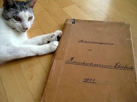 Jubiläums-Festtag auf dem Leopoldsplatz Das Gründungsbuch aus dem Jahr 1913 mit Katze Minni, die dem Tierschutzverein ihr Leben verdankt. (Foto: privat)