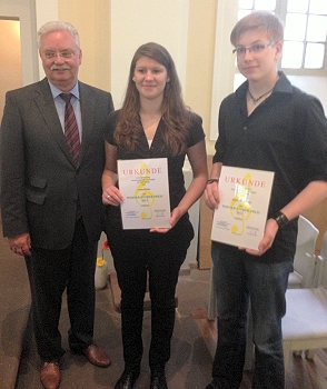 Preis der Werner-Stober-Stiftung in Karlsruhe übergeben Schulleiter freut sich mit Louisa Klein und Simon Buchmüller über die errungene Auszeichnung. (Foto:privat)
