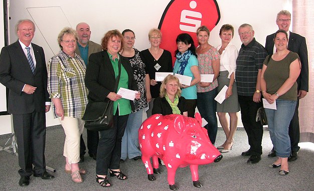 Gewinnsparer fördern gemeinnützige Einrichtungen (Foto: Claudia Richter)(cr) Regelmäßig beteiligen sich Kunden der Sparkasse Neckartal-Odenwald am Lotteriesparen "Spielend sparen und gewinnen" und unterstützen so indirekt gemeinnützige, kulturelle und soziale Einrichtungen. In Eberbach wurde heute der Lotterie-Reinertrag von 12.000 Euro für den Regionalmarkt Eberbach von Sparkassendirektor Gerhard Stock und Regionaldirektor Karlheinz Emig an insgesamt neun Organisationen übergeben.