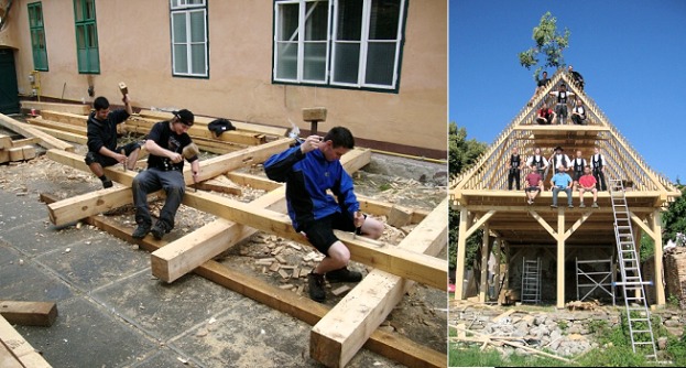 Am nächsten Morgen, nach einem kräftigen Frühstück, gingen alle Schüler begeistert ans Werk. Während eine Gruppe damit begann, den Bauplatz einzumessen und die Punktfundamente zu setzen, wurden die ersten Bauteile abgebunden (zugeschnitten). Dabei zeigte sich schon schnell der Unterschied zum „normalen“ Werkstattunterricht. Pfostenquerschnitte von 20/20 Zentimetern ließen die Berufsfachschüler die ersten Tage ausgeglichen ins Bett fallen. Die wildromantische Umgebung und die typische Landesküche leisteten einen wertvollen Beitrag zur Arbeitsmoral, so dass bereits am Ende der ersten Woche die Vorfertigung abgeschlossen war. Dabei konnte auch das Wetter dem Projekt keinen Strich durch die Rechnung machen. Untypisch für die Jahreszeit regnete es täglich, glücklicherweise aber fast nur zu Nacht- und Ruhezeiten.