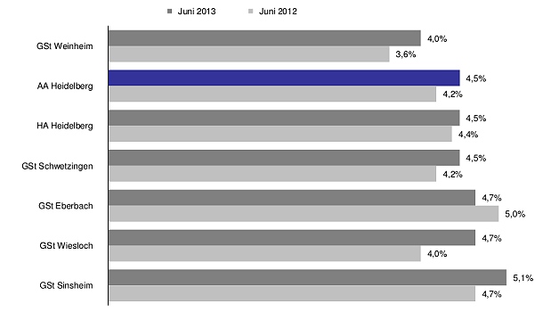 Geringer Rückgang der Arbeitslosigkeit Arbeitslosenquoten im Juni. (Grafik: Bundesagentur für Arbeit)(bro) (aa) Von Mai auf Juni ist die Zahl der arbeitslosen Menschen im Bezirk der Agentur für Arbeit Heidelberg um 206 auf 15.745 gesunken. Gegenüber dem Vorjahr ist die Arbeitslosigkeit jetzt um 1.272 höher. Die Arbeitslosenquote im Juni liegt unverändert bei 4,5 Prozent.