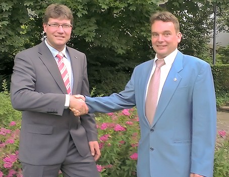 Präsidentenplakette an Heiko Stumpf übergeben Heiko Stumpf (re.) übernimmt das Präsidentenamt von Jörg Kaschper. (Foto: privat)(bro) (rs) Beim offiziellen Abend im Juli fand im Clublokal „Cafe - Restaurant am Leopoldsplatz“ die Amtsübergabe beim Lions-Club Eberbach statt.