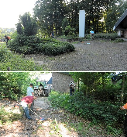 Zum Einsatz kamen dabei u. a. Schaufeln und Schaber, Hochdruckreiniger, Freischneider, Motorsäge, Heckenschere und auch ein Schlepper zum Abfahren des angefallenen Grünguts.