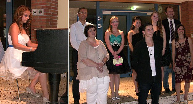 Feierliche Zeugnisausgabe trotz Absage der Schulleitung Mascha Tsybuleuskaya am Klavier, rechts die Jahrgangsbesten mit ihren Lehrern. (Fotos: Claudia Richter)(cr) Gestern Abend erhielten an der Eberbacher Werkrealschule insgesamt 30 Schülerinnen und Schüler ihre Abschlusszeugnisse. Eltern, Lehrer und Schüler organisierten gemeinsam die interne Veranstaltung.