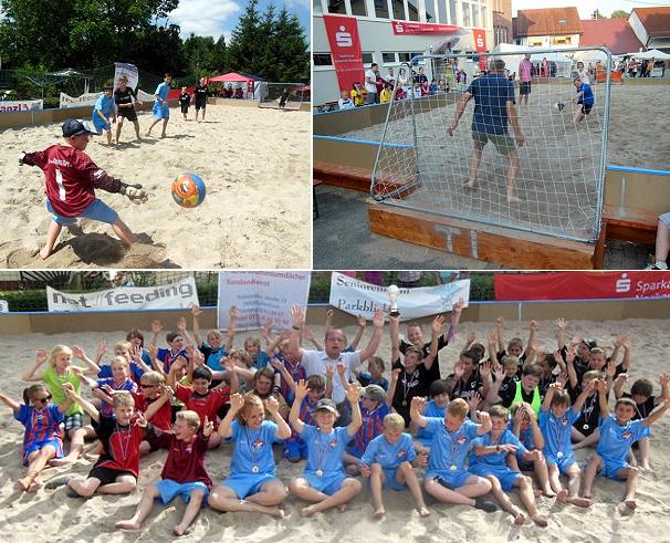 Der Sonntag stand dann ganz im Zeichen des Jugendfußballs. Die Jugendmannschaften aus den Ortsteilen Schwanheim, Schönbrunn, Moosbrunn und Haag sowie aus Pleutersbach zeigten auf dem ungewohnten Sandboden, was sie können. Bevor das eigentliche Turnier der Sechs- bis Dreizehnjährigen begann, besiegte das Team der 14- bis 17-Jährigen aus Schwanheim die Altersgenossen aus Pleutersbach beim Auftaktspiel mit 4:2. Während des Turniers zeigten sich die Kinder und Jugendlichen vom Spiel auf dem Sandstrand begeistert. Mit einem Durchschnitt von 8,7 Toren pro Spiel stellten alle Beteiligten unter Beweis, dass sie auch auf ungewohntem Boden rasanten Fußball spielen können. Nach einem in jeder Hinsicht heißen Nachmittag entschied das Team Haag I das Turnier für sich und konnte den Wanderpokal aus den Händen von Bürgermeister Jan Frey entgegennehmen.