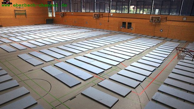 Etappenparty in der Au gefeiert In der großen Halle wurden rund 400 Matratzen für die Übernachtungsgäste ausgelegt, in der kleineren Halle im Untergeschoss noch einmal etwa 100. (Foto: Hubert Richter)Mehr Bilder (Klicken zum Vergrößern):