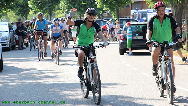 An die 2.000 Teilnehmer der Tour waren am Vormittag in Weinheim gestartet. Trotz sommerlicher Hitze mit Temperaturen von mehr als 35 Grad kamen die meisten Radler nach einer letzten gemeinsamen Pause in Mossbrunn gegen Abend wohlbehalten in Eberbach an. Mit Applaus wurden sie am Radweg im Sportgebiet in der Au empfangen. Dort warteten auf sie zunächst Erfrischungen in Form einer Wasserspritzanlage der Freiwilligen Feuerwehr und kühlenden Wasserschwämmen. Frischmachen konnten sich die Sportler auch in einem eigens zum Duschen aufgestellten "Showertruck". Zusammen mit den Tourveranstaltern des Südwestrundfunks und der EnBW hatten die Eberbacher unter Federführung des Kulturamts ein großes Fest vorbereitet. Am Nachmittag spielte die Musikkapelle "Kleiner Odenwald" aus Allemühl, und gegen Abend zog Jongleur "Jeremy" Klein und Groß in seinen Bann. Die eigentliche Etappenparty startete um 19 Uhr mit den Bands "Schlagerfeld" und der "Spider Murphy Gang" auf der großen Showbühne, vor der ein riesiger runder Pavillon aufgebaut war. Um 22 Uhr war schon wieder Schluss, nachdem die Stars aus Bayern mit Hits wie "Skandal im Sperrbezirk" für ausgelassene Stimmung gesorgt hatten. Denn die Radler brauchten ihren Schlaf für die nächsten Etappen, die an insgesamt sieben Tagen von Weinheim bis Stockach am Bodensee führen. Heute Morgen machten sich die Radler nach dem Frühstück auf in Richtung Bad Mergentheim. Übernachtet hatten viele von ihnen im Matratzenlager der Hohenstaufen-Sporthalle, wo 500 Schlafplätze vorbereitet waren, oder in Zelten auf dem Rasendreieck neben dem Fußballstadion. Einige Teilnehmer waren auch in umliegenden Hotels untergebracht, wofür Shuttlebusse eingesetzt waren.