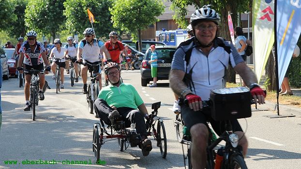 An die 2.000 Teilnehmer der Tour waren am Vormittag in Weinheim gestartet. Trotz sommerlicher Hitze mit Temperaturen von mehr als 35 Grad kamen die meisten Radler nach einer letzten gemeinsamen Pause in Mossbrunn gegen Abend wohlbehalten in Eberbach an. Mit Applaus wurden sie am Radweg im Sportgebiet in der Au empfangen. Dort warteten auf sie zunächst Erfrischungen in Form einer Wasserspritzanlage der Freiwilligen Feuerwehr und kühlenden Wasserschwämmen. Frischmachen konnten sich die Sportler auch in einem eigens zum Duschen aufgestellten "Showertruck". Zusammen mit den Tourveranstaltern des Südwestrundfunks und der EnBW hatten die Eberbacher unter Federführung des Kulturamts ein großes Fest vorbereitet. Am Nachmittag spielte die Musikkapelle "Kleiner Odenwald" aus Allemühl, und gegen Abend zog Jongleur "Jeremy" Klein und Groß in seinen Bann. Die eigentliche Etappenparty startete um 19 Uhr mit den Bands "Schlagerfeld" und der "Spider Murphy Gang" auf der großen Showbühne, vor der ein riesiger runder Pavillon aufgebaut war. Um 22 Uhr war schon wieder Schluss, nachdem die Stars aus Bayern mit Hits wie "Skandal im Sperrbezirk" für ausgelassene Stimmung gesorgt hatten. Denn die Radler brauchten ihren Schlaf für die nächsten Etappen, die an insgesamt sieben Tagen von Weinheim bis Stockach am Bodensee führen. Heute Morgen machten sich die Radler nach dem Frühstück auf in Richtung Bad Mergentheim. Übernachtet hatten viele von ihnen im Matratzenlager der Hohenstaufen-Sporthalle, wo 500 Schlafplätze vorbereitet waren, oder in Zelten auf dem Rasendreieck neben dem Fußballstadion. Einige Teilnehmer waren auch in umliegenden Hotels untergebracht, wofür Shuttlebusse eingesetzt waren.
