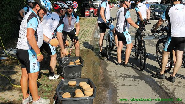 Etappenparty in der Au gefeiert Wasserschwämme waren bei 36 Grad Hitze zur Erfrischung gefragt. (Foto: Hubert Richter)Mehr Bilder (Klicken zum Vergrößern):