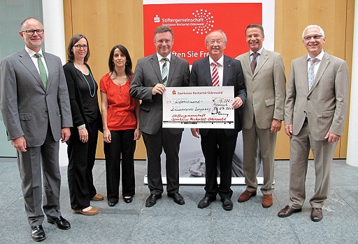 Der Vorstandsvorsitzende der Stiftergemeinschaft Sparkasse Neckartal-Odenwald, Sparkassendirektor Gerhard Stock, übergab zwei Wochen vor der Premiere auf Schloss Zwingenberg am 2. August Landrat Dr. Achim Brötel und den beiden Geschäftsführerinnen der Schlossfestspiele, Heike Brock und Ilka Metzger, im Beisein seiner Stiftungsvorstandskollegen, Oberbürgermeister Michael Jann und Sparkassendirektor Helmut Augustin, eine Fördersumme in Höhe von 15.000 Euro.