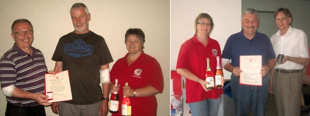 Viele Spendenwillige trotz Hitze und Urlaubszeit Links: Der 1. Vorsitzende Egon Scheuermann, Gerhard Friedrich, der für seine 125. Blutspende mit Urkunde und Ehrennadel geehrt wurde, und Birgit Schäfer von der DRK-Ortsvereinigung Sensbachtal. Re: Die 2. Vorsitzende der DRK-Ortsvereinigung Sensbachtal, Beate Beisel, bedankte sich bei Hans-Jürgen Völker für seine 100. Blutspende. Er wurde vom Blutspendedienst Baden-Württemberg/Hessen mit einer Urkunde und einer Ehrennadel geehrt und erhielt ein Präsent. (Fotos: privat)(bro) (sens) Am 16. Juli fand der dritte Blutspendetermin der DRK-Ortsvereinigung Sensbachtal für das Jahr 2013 in Hebstahl statt.