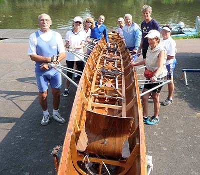 Zuerst unter der Autobahn und einer Eisenbahnbrücke hindurch mit Rückblick auf den mächtigen Dom in Limburg. Dann idyllische Landschaft im Naturpark Hoch-Taunus. Als die Boote unter der längsten Fußgänger- und Fahrradbrücke Deutschlands aus Holz hindurch waren, kam auch schon die mächtige romanische Lubentiuskirche in Dietkirchen in Sicht. Und das Beste, nicht ein einziges Motorboot, nur einige Paddler kamen ihnen entgegen. Bald wussten sie warum. Nach einigen Kilometern wurde das Gewässer ruppig. Plötzliche Flachwasser, hier und da Steinplatten, weit herausragende steinige Buhnen und tückische Strömungsstellen erforderten höchste Aufmerksamkeit und Ruderkraft, um hindurchzukommen. Ein nur mit drei Mann besetztes Boot wurde immer wieder quer getrieben und musste schließlich mit einem Seil, durchs Wasser watend, durch die tückische Stelle gezogen werden. Eine gute Stunde später als geplant und ganz schön geschafft kamen die Ruderer in Runkel an. Ein verspätetes Mittagessen mit Blick auf die Alte Brücke und die Burg versöhnte alle mit den unerwarteten Strapazen. Der Rückweg, mit Strömung, war dann ein leichtes Spiel.