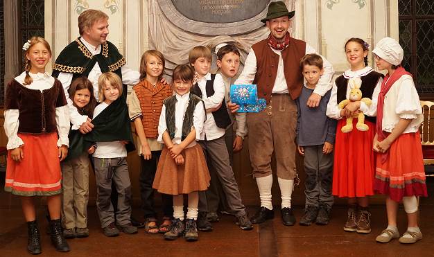 Meister Röckle und der Teufel  Der Kinderchor der Schlossfestspiele Zwingenberg mit König (Holger Ries, l.) und Meister Röckle (Alexander Yagudin, Mitte). (Foto: Schlossfestspiele)(hr) (bnc) Neben Oper (Der Freischütz) und Operette (Die Fledermaus) steht bei den Schlossfestspielen Zwingenberg auch in diesem Jahr wieder Musiktheater für Kinder auf dem Programm.
