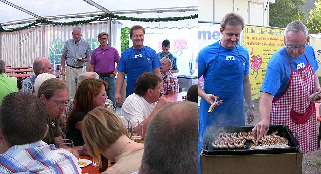 Gestern lud die Stadtverwaltung die Frauen und Männer zu einem Helferfest in das für den Kuckucksmarkt aufgebaute Mostzelt der Karnevalgesellschaft Kuckuck auf dem Festgelände in der Au ein. Bürgermeister Peter Reichert, der ebenso wie Kulturamtsleiter Tobias Soldner als Grillmeister tätig war, begrüßte die etwa 120 Anwesenden und dankte ihnen für die gelungene Veranstaltung am letzten Juliwochenende. Auch KGK-Vizepräsident Markus Scheurich, bei dem vor, während und nach der Radveranstaltung die organisatorischen Fäden zusammenliefen, zeigte sich äußerst zufrieden über die Durchführung und das Ergebnis dieses Events. Man könne, obwohl man aufgrund der hohen Temperaturen am Mittag nur wenig Umsatz habe machen können, mit einem Gewinn von rund 11.000 Euro rechnen. Dieses Geld wird nach einem intern geregelten Verteilungsschlüssel anteilmäßig an die jeweiligen Vereine ausgezahlt. Scheurich und auch viele Helfer waren sich darüber einig, dass die Mitglieder aller Vereine während der Planungsphase und am Veranstaltungstag gemeinsam Hand in Hand gearbeitet hätten. Man hätte versucht, alle größeren und kleineren Probleme zu beheben und aus Fehlern, die eventuell gemacht wurden, habe man für die Zukunft gelernt. Engpässe habe es teilweise an den Getränkeausgaben gegeben. Hier habe man sich auf die Erfahrungswerte und die Pläne von SWR 4 verlassen. "Bei der nächsten Veranstaltung machen wir das besser" stellte Scheurich fest.