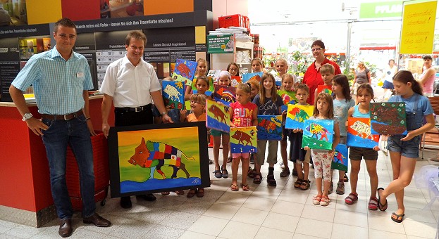 Dort malten sie unter Anleitung von Sybille Lischke den Eberbacher Eber mit Acrylfarben auf einen Keilrahmen. Anschließend gestalteten alle Kinder gemeinsam einen großen Eber für Bürgermeister Peter Reichert. Diesen erhielt er bei seinem Besuch im Baumarkt als Andenken. Er freute sich sehr über das farbenfrohe Geschenk und versprach den Kindern, einen schönen Platz dafür im Rathaus zu finden.