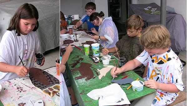 Bei Ulrike Riedl, Vorstandsmitglied des Fördervereins "Waldklassenzimmer Eberbach", wurden heute Nachmittag von Kindern Sperrholzplatten zugesägt, glatt geschliffen und bemalt. Riedl hat im Zuge des Eberbacher Ferienprogramms Mädchen und Jungen im Alter von 10 bis 14 Jahren eingeladen, Tierfiguren aus Sperrholz herzustellen. Diese Tierbilder gehören zu der Ausstattung des Waldklassenzimmers im Gretengrund und werden ständig bei waldpädagogischen Aktionen zum Zeigen eines "Pirschpfades" eingesetzt.