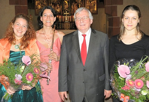 Der erste Teil war Werken J.S. Bachs gewidmet, so der Sonate für Flöte und Klavier e-Moll, der Sonate für Violine und Klavier G-Dur aus Bachs Köthener Zeit. Hier entfaltete sich Bachs kompositorische Kunst im Wechselspiel der jeweiligen gleichberechtigten Instrumente. Die Arie "Oh, wie schmeckt der Coffee süße" veranlasste KMD Schumann zu einigen vorausgehenden Kommentaren über den Kaffeegenuss zu Bachs Zeiten sowie den Nöten eines Vaters, für die Tochter einen standesgemäßen Ehemann zu finden. Den angebotenen Kaffee schlugen die Musiker jedoch aus, um gleich zu musizieren. Ein besonderes klangliches Erlebnis waren auch die vorgetragenen Arien, die in der Atmosphäre der Klosterkirche besonders zur Geltung kamen ("Halleluja" aus Mozarts Exultate jubilate, "Nun beut die Flur das frische Grün" aus Haydns Schöpfung). Eindrucksvoll war auch die Kombination Flöte -Sopran in Albert Roussels 2 Poemes des Ronsard, in der die Nöte eines Liebhabers geschildert werden, da die Angebetete lieber dem Gesang einer Nachtigall lauscht . Ihre ganze Virtuosität zeigten die Musikerinnen bei H. Wieniawskis Tempo di Saltarella für Violine Solo und E. Bozzas "Image" für Flöte Solo. Paganinis Bravour Variationen für Violine und Klavier über ein Thema aus Rossinis Oper "Moses in Ägypten" sowie Verdis Fantaisie sur la Traviata für Flöte und Klavier rundeten das Programm ab.