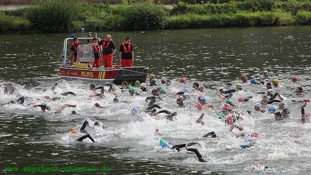 193 Einzelstarter und 16 Staffelteams kamen heute Morgen an den Neckar, wo sie mit einem Ponton zur Startlinie auf Höhe der Rudergesellschaft gebracht wurden. Um 9 Uhr fiel der Startschuss für den dreiteiligen Wettbewerb, der wieder aus 700 Meter Schwimmen, 21 km Radfahren und 6 km Laufen bestand. Nach wenigen Minuten im 18 Grad kalten Flusswasser erreichten die ersten Sportler die DLRG-Station, wo sie zu Fuß unter dem Beifall der Zuschauer in die Wechselzone vor dem Badezentrum spurteten. Von dort ging es auf die Räder in Richtung Pleutersbach. Die 21 km lange Strecke musste in diesem Jahr aufgrund der Straßenbauarbeiten zwischen Allemühl und Schönbrunn anders geführt werden: Die Radler mussten die schmale Straße von Allemühl nach Schwanheim hinauftreten, und nach dem Wendepunkt ging es wieder steil bergab zurück. Erneut vor dem Badezentrum angekommen, wurde das Rad gegen Laufschuhe getauscht. Drei Kilometer führte die Strecke auf dem Uferweg bis hinter Pleutersbach zum Wendepunkt und wieder zurück.