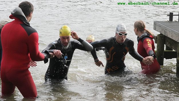 193 Einzelstarter und 16 Staffelteams kamen heute Morgen an den Neckar, wo sie mit einem Ponton zur Startlinie auf Höhe der Rudergesellschaft gebracht wurden. Um 9 Uhr fiel der Startschuss für den dreiteiligen Wettbewerb, der wieder aus 700 Meter Schwimmen, 21 km Radfahren und 6 km Laufen bestand. Nach wenigen Minuten im 18 Grad kalten Flusswasser erreichten die ersten Sportler die DLRG-Station, wo sie zu Fuß unter dem Beifall der Zuschauer in die Wechselzone vor dem Badezentrum spurteten. Von dort ging es auf die Räder in Richtung Pleutersbach. Die 21 km lange Strecke musste in diesem Jahr aufgrund der Straßenbauarbeiten zwischen Allemühl und Schönbrunn anders geführt werden: Die Radler mussten die schmale Straße von Allemühl nach Schwanheim hinauftreten, und nach dem Wendepunkt ging es wieder steil bergab zurück. Erneut vor dem Badezentrum angekommen, wurde das Rad gegen Laufschuhe getauscht. Drei Kilometer führte die Strecke auf dem Uferweg bis hinter Pleutersbach zum Wendepunkt und wieder zurück.