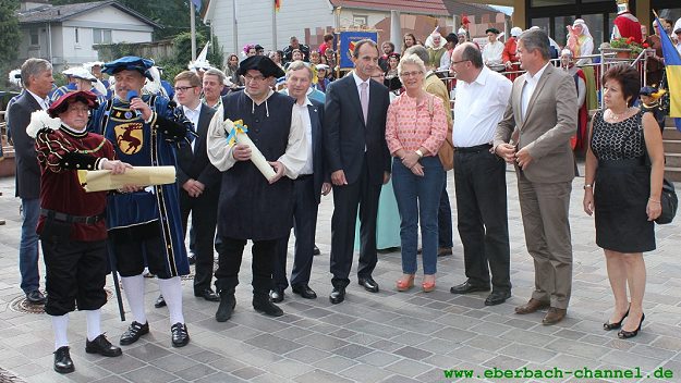 Nach Grußworten des Landrates des Kreises Bergstraße Matthias Wilkes, der Begrüßung durch Bürgermeister Rainer Sens, der Verkündung der Marktordnung durch den Marktvogt und einigen ohrenbetäubenden Böllerschüssen zog man weiter zur Bühne auf dem Château-Landon-Platz. Den Fassbieranstich übernahm der hessische Minister für Bundes- und Europaangelegenheiten Michael Boddenberg, bevor es die ersten Darbietungen auf der Bühne zu sehen gab. Dort wechselten sich Ritterkämpfe mit Musik und Komik, mit Gauklern und mit Zaubereien bis zum Abend halbstündlich ab.