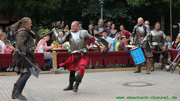 Schon am Samstagmorgen begann das bunte Spektakel mit dem Einzug der Fanfarenzüge der Stadt Eberbach, der Goldstadt Pforzheim und den Fahnenschwingern der Ritter zu Hirschhorn. Diese geleiteten Bürger, Ritter, Sarazenen, Kaufleute, Händler, Gaukler, Tänzer, Musikanten, Zauberer, Seher, Bettler und Stelzenläufer aus der Altstadt und aus dem Handwerkerdorf auf dem Château-Landon-Platz und trafen sich zur Eröffnung des Ritterfestes auf dem Rathausvorplatz.