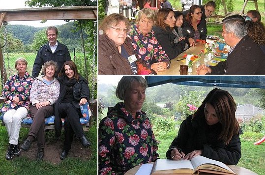 Integrationsministerin Öney besuchte Garten in der Au (Foto links) v.li.: Charlotte Schneidewind-Hartnagel, Doris Lenz, Ministerin Bilkay Öney, dahinter Bürgermeister Peter Reichert; (Foto rechts oben) die Ministerin (3.v.li.) im Gespräch; (Foto rechts unten) die Ministerin beim Eintrag in das Ehrenbuch der Stadt Eberbach (Fotos: Nicole Kolbe)(ko) Auf Einladung der Stellvertretenden Fraktionsvorsitzenden von Bündnis90/Die Grünen im Stuttgarter Landtag Charlotte Schneidewind-Hartnagel besuchte gestern Nachmittag die Integrationsministerin des Landes Baden-Württemberg Bilkay Öney den Interkulturellen Garten in Eberbach.