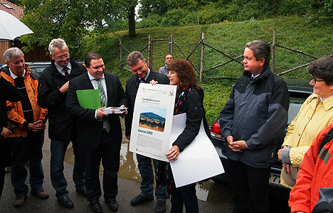 Dr. Jutta Weber (3.v.re.) überreicht Bürgermeister Markus Haas (3.v.li.) die Auszeichnung sowie das eigens aufgelegte Faltblatt zum Geotop des Jahres 2013. Auch die Landräte Dr. Achim Brötel (4.v.li.) und Matthias Wilkes (2.v.re.) sowie MdB Alois Gerig (2.v.li.) gratulierten. Auch aus dem Partnerlandkreis Vas in Ungarn waren Gäste mit Vizepräsident Ferenc Marton (li) an der Spitze auf den Katzenbuckel gekommen. Darüber hinaus war Dr. Ulrike Mattig (re.) vom Hessischen Wissenschaftsministerium als Vorsitzende des Expertengremiums „Nationale Geoparks“ nach Waldbrunn gekommen, um die Gründe für die Wahl zu erläutern. (Foto: Hofherr)(hof) Im Beisein einer Delegation aus dem ungarischen Komitat Vas mit dem Vizepräsident Ferenc Marton und dem Vorsitzenden der ungarischen Naturparke Bela Básthy wurde der Katzenbuckel auf der Gemarkung Waldbrunn, mit 626 Metern Höhe der höchste Berg des Odenwalds, vom UNESCO-Geopark Bergstraße-Odenwald, der von Landrat Matthias Wilken als dessen Vorsitzenden und von Dr. Jutta Weber vertreten wurde, als „Geotop des Jahres 2013“ ausgezeichnet. Anlässlich dieser Auszeichnung wurde nicht nur eine Urkunde, sondern auch eine eigens aufgelegte Broschüre an den sichtlich stolzen Bürgermeister Markus Haas übergeben. Verantwortlich für die Wahl des Vulkanhärtlings zum Geotop war das Expertengremium „Nationale Geoparke“, dessen Vorsitzende Dr. Ulrike Mattig ebenfalls an den Katzenbuckel gekommen war. Darüber hinaus konnte der kommunale Hausherr Markus Haas auch den Landrat des Neckar-Odenwald-Kreises, Dr. Achim Brötel und den Bundestagsabgeordneten Alois Gerig willkommen heißen. Darüber hinaus waren die Bürgermeister Peter Reichert (Eberbach), Egon Scheuermann (Sensbachtal), Rolf Reinhard (Abtsteinach) und Norman Link (Neckargerach und Zwingenberg). Außerdem waren Waldbrunns Bürgermeister a.D. Klaus Schölch und die Geschäftsführerin des Naturparks Neckartal-Odenwald Cordula Samuleit gekommen, um an der Feierstunde teilzunehmen.