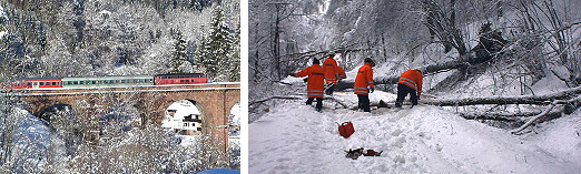 Dutzende Bäume mussten abgesägt werden Links einer der ersten Regionalexpresszüge von Stuttgart nach Frankfurt, rechts Kräfte der Freiwilligen Feuerwehr Friedrichsdorf bei Räumarbeiten auf der Strecke am vergangenen Sonntag (Fotos:Claussen/Friedrich)(jc) Die Bahngleise der Odenwaldbahn zwischen Eberbach und Erbach sind wieder frei. Helfer von THW und Feuerwehr hatten in den letzten Tagen auf dem rund 30 Kilometer langen Abschnitt rund 150 Bäume zu zersägen. Die dicksten Bäume lagen zwischen Kailbach und Gaimühle auf den Gleisen. Andere waren vom Schneebruch so stark geschädigt, dass sie gefällt werden mussten. Auch Privatfirmen waren an den Räumarbeiten beateiligt. Da die Züge momentan aber nur mit stark reduzierter Geschwindigkeit verkehren, ist mit erheblichen Verspätungen zu rechnen. Die Odenwaldbahn musste – wie berichtet – am vergangenen Samstag ihren Betrieb einstellen, nachdem zwei Abendzüge nicht mehr weiterkamen. In Kailbach wurden 166 Reisende in Notquartieren untergebracht.