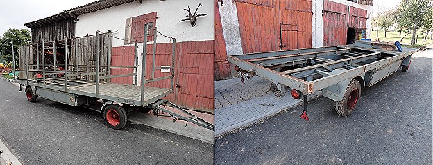 Karnevalfreunde sind nun stolze Besitzer eines eigenen Faschingswagens Li.: Der Dachstuhlwagen nach der Ankunft in Scheidental. Re.: