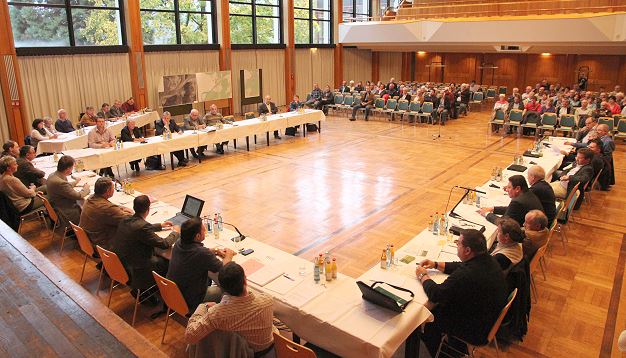 Gemeinderat will sich den mehrheitlich ablehnenden Grundstückseigentümern anschließen Der Eberbacher Gemeinderat und der Pleutersbacher Ortschaftsrat tagten heute im großen Saal der Stadthalle. (Foto: Hubert Richter)(hr) Mit der Frage, ob im Bereich Pleutersbach das begonnene Flurbereinigungsverfahren weitergeführt werden soll, befasste sich heute Abend der Eberbacher Gemeinderat.