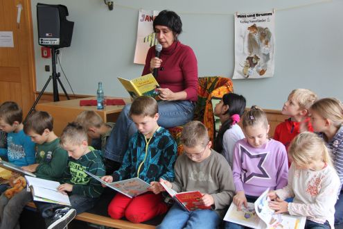 Auf der Reise durch ein Geschichtenbuch Kinderbuchautorin Andrea Karime mit ein paar ihrer Zuhörer/innen (Foto:Renate Dengel)(rd) Eine lustige und zugleich spannende Vorlesestunde durften die Zweitklässler der Dr. Weiß-Grundschule am Mittwoch in der Stadtbücherei erleben.