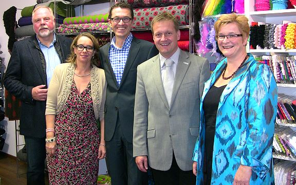 Umzug vom Scheuerberg in die Friedrichstraße V.l. Dietrich Müller, Carmen und Sascha Back, Peter Reichert und Brigitte Eppinger.(Foto: Claudia Richter)(cr) Die Neueröffnung eines Geschäfts mit Angeboten rund ums Nähen wurde gestern in Eberbachs Innenstadt gefeiert. Sowohl Bürgermeister Peter Reichert als auch der Vorsitzende der Eberbacher Werbegemeinschaft (EWG), Dietrich Müller, freuten sich über die Belebung der Innenstadt.