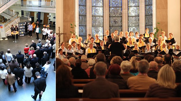 Gestern Nachmittag wurden die Chormitglieder aus Frankreich von Bürgermeister Reichert im Foyer des Rathauses offiziell begrüßt (Bild links). Um 18 Uhr begann dann in der katholischen Kirche St. Johannes Nepomuk ein Chorkonzert (Bild rechts) zusammen mit der Evangelischen Kantorei unter Leitung von Bezirkskantor Achim Plagge und der Katholischen Kantorei unter Leitung von Julia Bentz. Das Programm bei freiem Eintritt umfasste klassischer Musik, Kirchenmusik sowie italienische und französische Volkslieder.