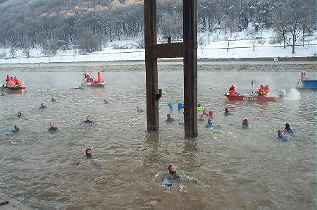 22. Neckarschwimmen der DLRG Eberbach (Foto:DLRG)(jc) (ah) Mehr als 30 Taucher und Rettungsschwimmer folgten der Einladung der DLRG Eberbach und kamen heute zum traditionellen Neckarschwimmen. Das Wasser war mit 5 Grad über Null etwa 20 Grad wärmer als die Luft und damit vergleichsweise "warm". Der Start war wieder im Unterwasser der Schleuse Rockenau. Gut geschützt mit ihren Tauchanzügen bewältigten die Schwimmer ohne Zwischenfälle die 3,8 km lange Schwimmstrecke. Zur Absicherung begleiteten Boote der DLRG und die Wasserschutzpolizei das Schwimmen. Am Ziel an der DLRG-Station gab es für die Schwimmer wärmenden Glühwein und eine heiße Dusche im Hallenbad. Das gemeinsame Mittagessen war der Abschluss der Veranstaltung.