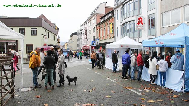 Aufgrund des regnerischen Starts zog es diesmal nicht so viele Besucher zum traditionellen Eberbacher Herbstevent wie üblich. Dennoch gab es unter Federführung der "Eberbacher Werbegemeinschaft" (EWG) wieder ein rundes Angebot aus Shopping, Information, Musik, und Kulinarischem, und das fast ohne Abstriche. Lediglich der angekündigte Auftritt der Band "Simplex" auf dem Lindenplatz fiel buchstäblich ins Wasser, da die bereitstehende Bühne nicht genügend Nässeschutz für die Instrumente bot. Beim Flohmarkt auf dem REWE-Parkplatz war das Angebot nicht ganz so reichhaltig wie sonst, dennoch ließen es sich einige Anbieter nicht nehmen, trotz Dauerregen ihre Stände aufzubauen.