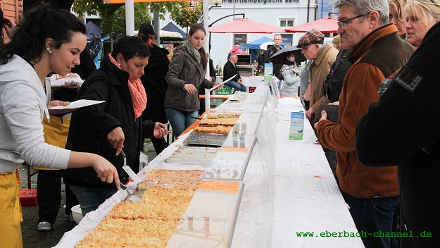 Aufgrund des regnerischen Starts zog es diesmal nicht so viele Besucher zum traditionellen Eberbacher Herbstevent wie üblich. Dennoch gab es unter Federführung der "Eberbacher Werbegemeinschaft" (EWG) wieder ein rundes Angebot aus Shopping, Information, Musik, und Kulinarischem, und das fast ohne Abstriche. Lediglich der angekündigte Auftritt der Band "Simplex" auf dem Lindenplatz fiel buchstäblich ins Wasser, da die bereitstehende Bühne nicht genügend Nässeschutz für die Instrumente bot. Beim Flohmarkt auf dem REWE-Parkplatz war das Angebot nicht ganz so reichhaltig wie sonst, dennoch ließen es sich einige Anbieter nicht nehmen, trotz Dauerregen ihre Stände aufzubauen.